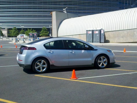 The Volt is a hybrid, but it takes the traditional hybrid system popularized by the Prius and turns it upside-down. While there is still the electric motor, storage battery, and gasoline engine, they perform different functions. On the Prius, the electric motor partially powers the wheels. On the Volt, the electric motor is the sole power source to the wheels. On the Volt the gas engine, which propels the Prius in conjunction with the electric motor, is used–wait for it–as a generator. The battery performs much the same function, but there are differences in that as well, which I’ll get to later. Because the gas engine is a generator in the Volt, it runs constantly after 40 miles of battery power (under normal use), but when the gas engine kicks in, the driving experience doesn’t change, save for the sound. This is one of the many crucial differences that sets the Volt apart from any other alternative-type car. Another is one big difference that sets it aside from the Nissan Leaf. There have been numerous news reports of the Leaf stranding its drivers in the middle of traffic due to the battery going flat after as little as 70 miles of driving. The Volt, however, will do over 300 miles on the combined charge and the tank of gas that runs the engine/generator. Range anxiety? Nope. The Volt is range relief.