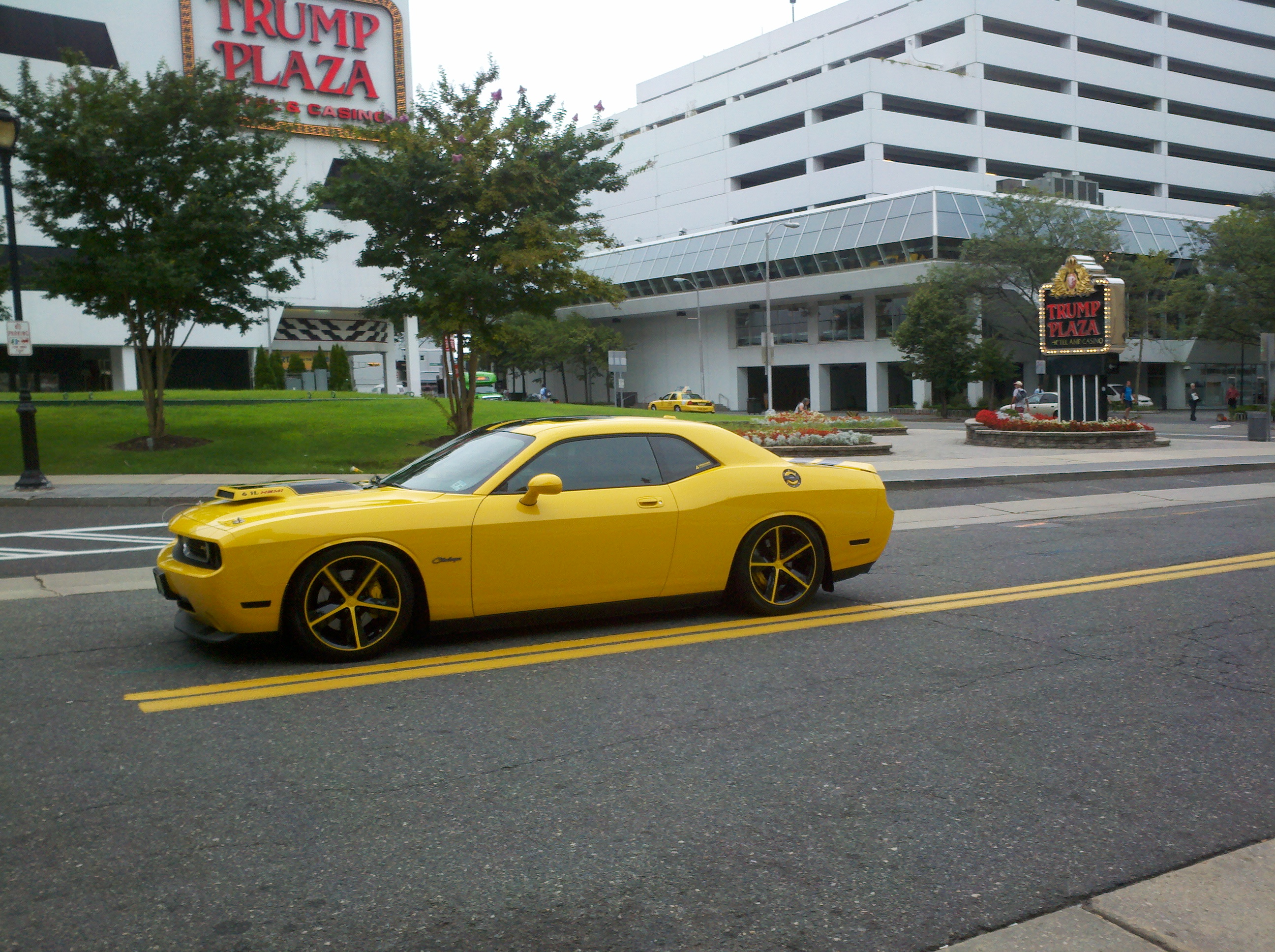 The overcast sky really brought this color out. Detonator Yellow is now my new favorite color on the Challenger. This thing sounded MEAN.Decided to take a quick walk after some gambling in Caesar’s at Atlantic City on Wednesday, and this bright yellow ponycar greets me with an eletrifying “hello.” It looks quite garish, especially with the yellow painted rims, but it sounded just as mean as it looked with that classic hood scoop, thanks to a custom exhaust.