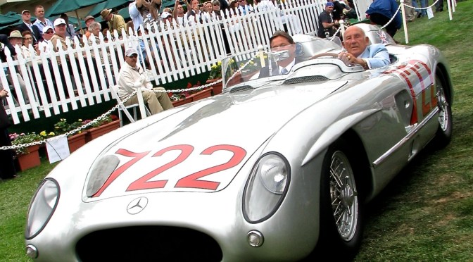 Taking a trip down memory lane, looking through the photos I’ve taken over the years, I stumbled across this gem from Pebble Beach in 2011. It’s none other than Sir Stirling Moss, and he’s driving the legendary Mercedes 300 SLR 722 in which he won the 1955 Mille Miglia. He set the all-time speed record for the Mille Miglia that year, and it has never been beaten. I realized I hadn’t shared it yet, and it definitely needed to be published.